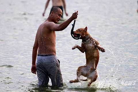 | Bến nước còn là nơi nhiều người đưa các chú chó cưng của mình xuống để tắm mát. |