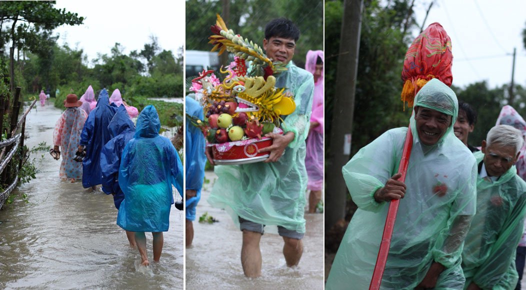 Đoàn bưng lễ nhà trai mặc áo mưa, lội bì bõm dưới nước bất chấp trời đang mưa và gió. (Ảnh: Công Sáng)