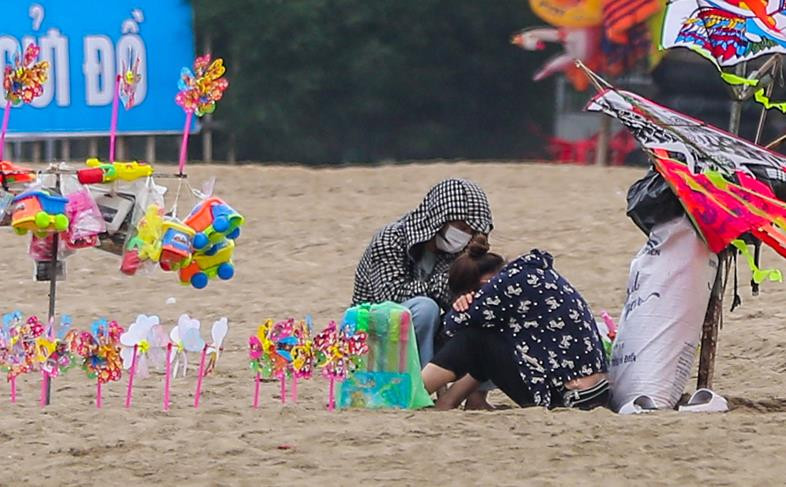 Người bán đồ chơi ở bãi biển Sầm Sơn tranh thủ nghỉ ngơi trong lúc vắng khách đến mua.