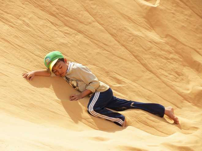 Cu Cò ở Mũi Né (Bình Thuận). Nhà nghèo hàng ngày em vào đồi cát hồng cho du khách thuê miếng trượt. Trung bình một ngày em kiếm được 100.000 đồng. Tất cả tiền em đều đưa cho mẹ để lo cho gia đình. Những lúc không có khách em lại cùng bạn bè ra đồi trượt cát để vui chơi.
