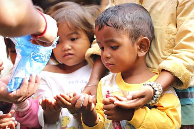 Em bé người dân tộc Châu Mạ ở Buôn Đăng Đừng, Bảo Lâm (Lâm Đồng) chìa tay nhận kẹo của một nhóm từ thiện tổ chức. Người dân tộc Mạ ở đây có cuộc sống nghèo đói và khổ sở. Do thiếu kiến thức về sức khỏe nên trẻ em thường không được chăm sóc chu đáo, gặp nhiều bệnh tật.
