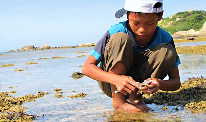 Em bé hái rau câu trên bãi Cỏ Ống, Vạn Thạnh, Vạn Ninh (Khánh Hòa). Hàng ngày vào lúc 16h, nước rút, em đi cắt rau câu, mỗi kg bán với giá 50.000 đồng. Tuy nhiên, tình trạng đánh bắt thủy hải sản bừa bãi khiến nguồn tài nguyên ngày càng cạn kiệt.