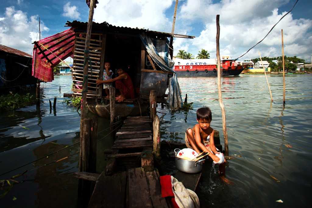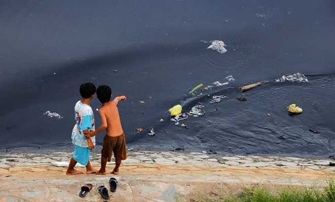 Hai em bé đứng chơi bên dòng kênh Tàu Hủ (quận 8, TP HCM), phía dưới là dòng nước đen, rác rưởi. Theo thời gian những dòng kênh xinh đẹp ô nhiễm nặng nề gây ra nhiều bệnh tật, hại cho sức khỏe người dân.