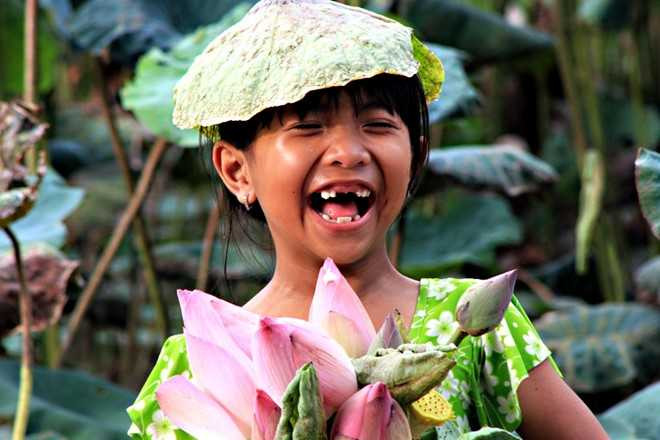 Em bé gái ở thị trấn Tràm Chim, huyện Tam Nông (Đồng Tháp). Nhà em làm nghề trồng sen bán. Một ngày em hái được khoảng 300 bông, giá 1.000 đồng/bông.