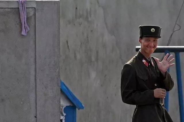 Người lính Triều Tiên ở Sinuiji mỉm cười vẫy tay với người chụp ảnh. (Ảnh: Eric Lafforgue)