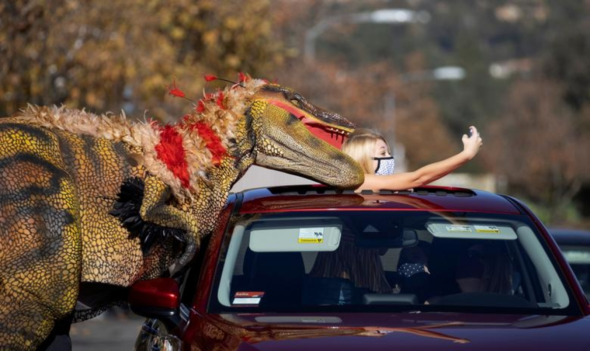 Bức ảnh con khủng long dường như đang "ngoạm" đầu cô gái thực ra là khoảnh khắc Samantha Baile chụp ảnh selfie với một nhân viên mặc bộ đồ khủng long tại "góc trải nghiệm" Jurassic bên ngoài sân vận động The Rose Bowl ở Pasadena, California ngày 15/1/2021.