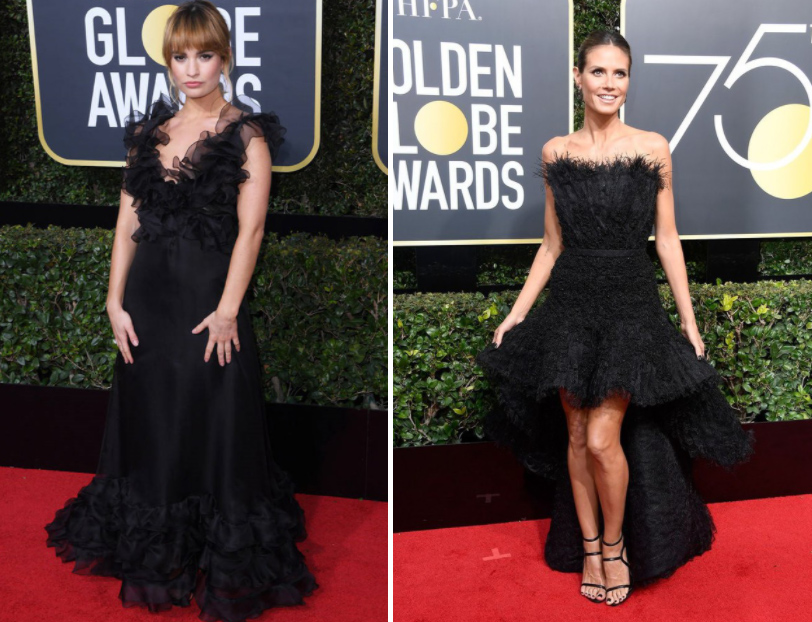 Từ trước đến nay, gu thời trang của Lily James vốn nhận được nhiều lời khen bởi sự duyên dáng, nữ tính. Tuy nhiên, tới Quả Cầu Vàng 2018, người đẹp lọt nhóm sao mặc thảm họa. Trong bộ đầm đen với chi tiết bèo nhún khiến James giống bà bầu trên thảm đỏ. Cùng với Lily James, Heidi Klum trở nên gầy gò khi chọn đầm high-low màu đen thay vì trang phục bó sát khoe đường cong như cô vẫn chọn. |