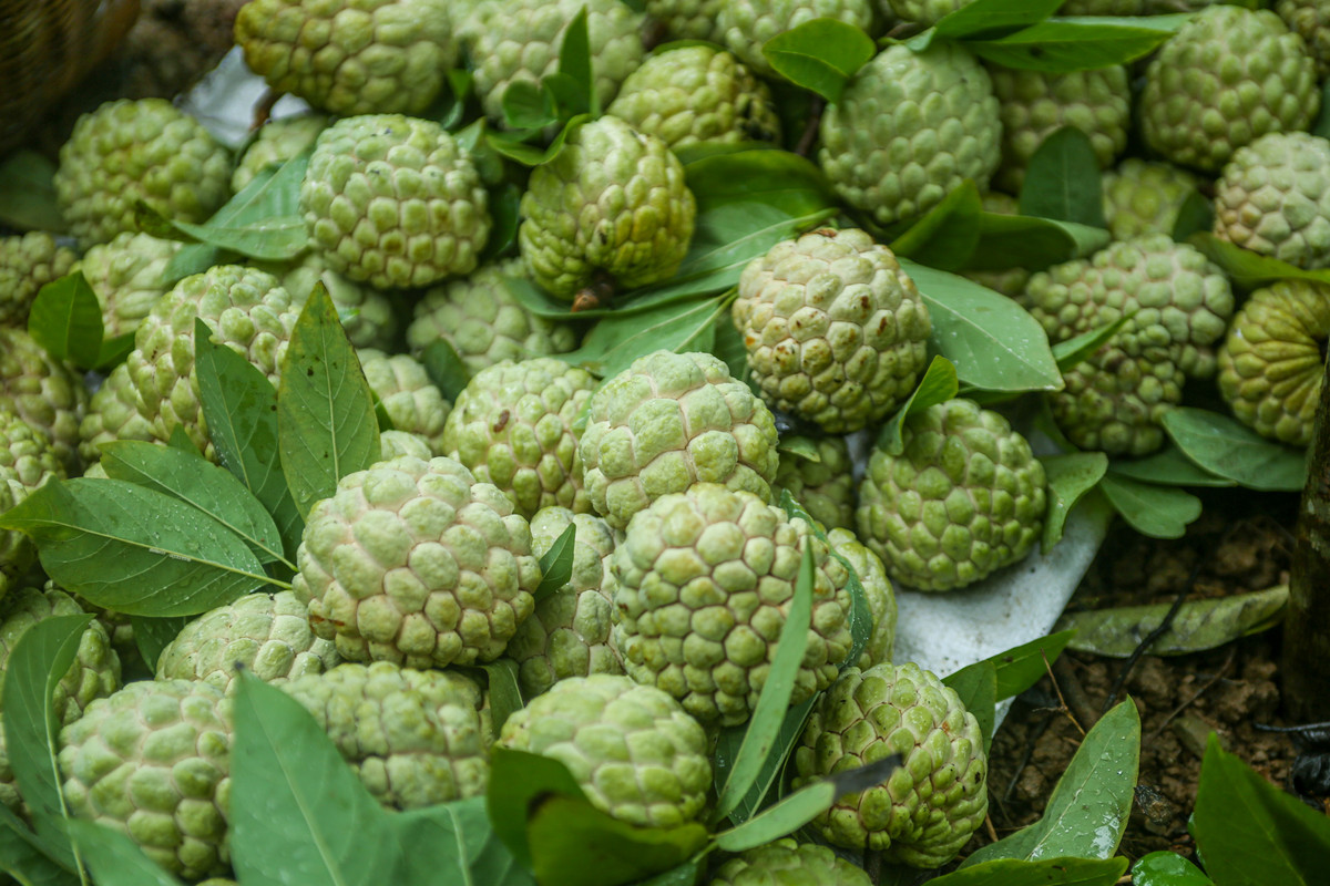 Sau khi thu hái, na được tập kết, phân loại và xếp vào thúng để gánh xuống chợ.