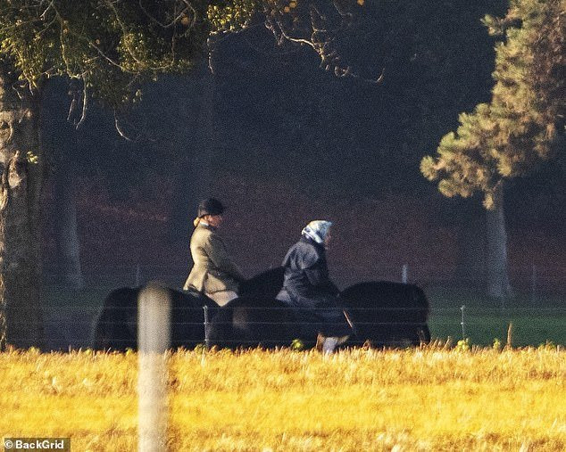 Tờ Daily Mail ngày 17/11 đăng tải những hình ảnh Nữ hoàng Anh mặc trang phục thoải mái cưỡi trên một con ngựa đen cùng với trợ lý cưỡi ngựa bên cạnh, trong một buổi chiều thu tại lâu đài Windsor. Bà mặc một chiếc áo khoác và đội khăn trùm đầu màu xanh.