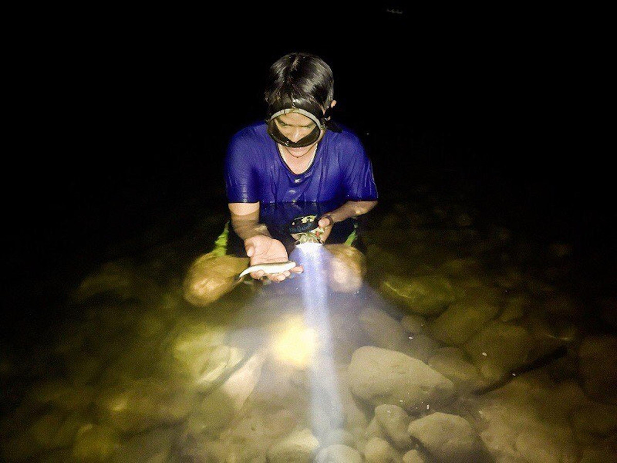 Ngoài thả lưới thì người dân địa phương còn có một cách khác để bắt loài "cá điên" là lội dưới những khe suối rọi đèn pin cho chúng chói mắt bơi yên một chỗ rồi sau đó dùng những chiếc nỏ tự chế để bắn.