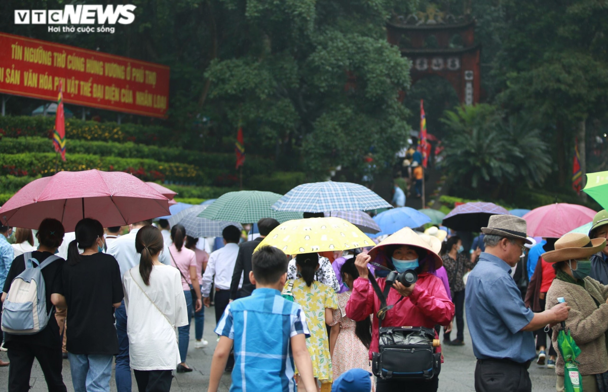 Theo ghi nhận của PV VTC News, từ 6h sáng, mặc dù trời mưa lớn nhưng lượng người đổ về Đền Hùng mỗi lúc một đông.