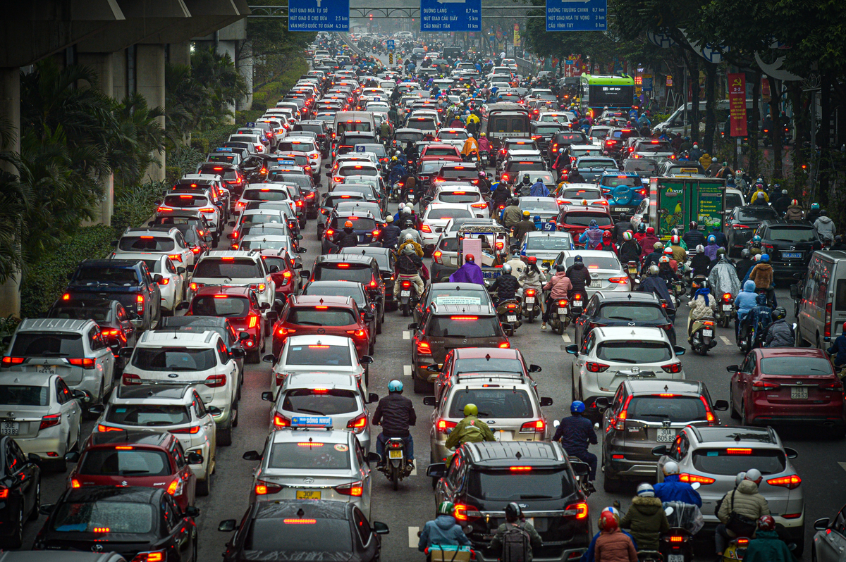 Hàng dài ô tô ken đặc đỗ tại nút giao đoạn Ngã Tư Sở hướng về trung tâm Thủ đô.