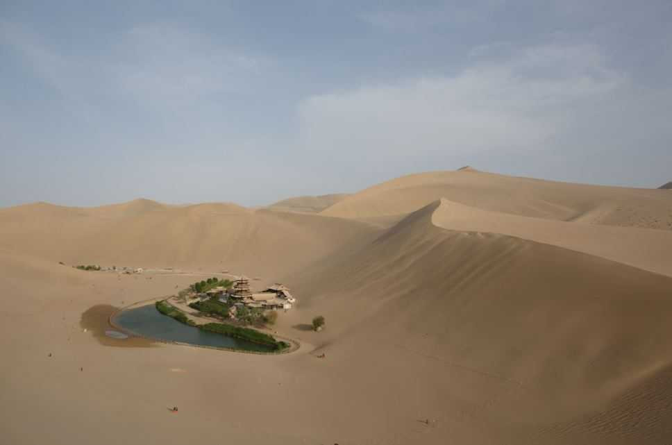 Ốc đảo là hồ bán nguyệt Yueyaquan nằm ở Đôn Hoàng, phía Tây Bắc của Trung Quốc bị vây quanh bởi các cồn cát khổng lồ