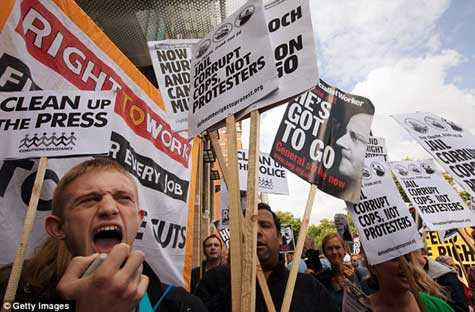 Bên ngoài Quảng trường Quốc hội, nơi diễn ra phiên điều trần chất vấn ông Murdoch, những người biểu tình đã tập trung và giơ cao các biểu ngữ phản đối như "Bỏ tù tập đoàn tham nhũng, chứ không phải những người biểu tình", "Ông ta phải ra đi", hay "Murdoch: Tội phạm truyền thông bị truy nã".