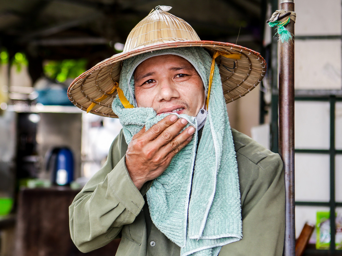 Ngoài kiệt sức vì kéo những xe hàng nặng vào giao cho nhà xe, các phu hàng còn phải đương đầu với cái nắng nóng gay gắt. Đa phần những phu hàng ở đây thường trang bị cho mình một cái khăn thấm nước để làm dịu bớt cái nóng.