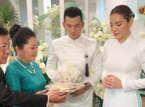 Đáng chú ý, nhà trai mang 88 cây vàng tương đương 5kg vàng cùng lắc tay, vòng tay, dây chuyền, bông tai đều có gắn kim cương trị giá 2 tỷ đồng làm sính lễ hỏi cưới. Ca sĩ Phương Trinh Jolie nói: "Số vàng mẹ chồng tặng tôi tương ứng với hai số cuối năm sinh của tôi - 1988. Với tôi, đây là con số may mắn. Vợ chồng tôi sẽ dùng của cải mẹ cho để kinh doanh".