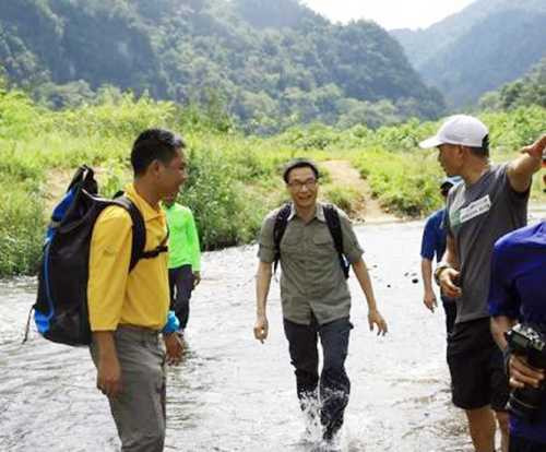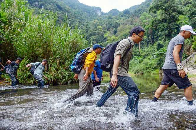 | Phó Thủ tướng Vũ Đức Đam cùng đoàn chuyên gia và kíp của kênh truyền hình Mỹ ABC News trên đường vào hang Sơn Đoòng |
