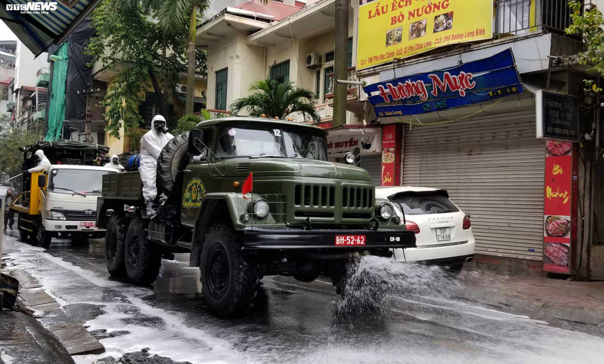 Trong sáng 7/3, Binh chủng Hóa học triển khai lực lượng đến khu vực các phố Trấn Vũ, Trúc Bạch và các phố xung quanh ở quận Ba Đình, Hà Nội để phun thuốc tiêu độc khử trùng.