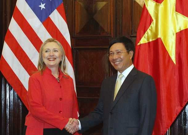 | Ngoại trưởng mỹ Hillary Clinton bắt tay với Bộ trưởng Ngoại giao Phạm Bình Minh trong chuyến thăm chính thức của bà đến Việt Nam |