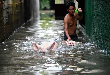 | Những chú lợn bơi giữa phố trong cơn lụt tại Manila, Philippines |