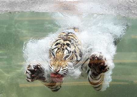 | Chủ hổ Bengal lao xuống nước vồ mồi tại công viên Six Flags Discovery Kingdom, Mỹ |