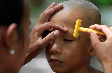 | Cậu bé đang được mẹ cạo tóc và lông mày trước khi vào tu ở chùa tại Phnom Penh, Cambodia |