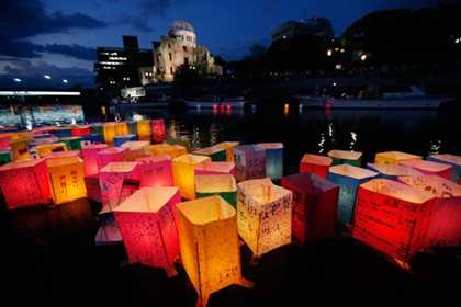 | Người dân Nhật thả đèn lồng giấy trên sông Motoyasu trong lễ tưởng niệm 67 năm bom nguyên tử hủy diệt thành phố Horoshima và Nagasaki |