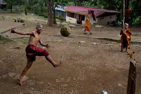 | Một nhà sư đang chơi đá bóng tại Tak, Thái Lan |