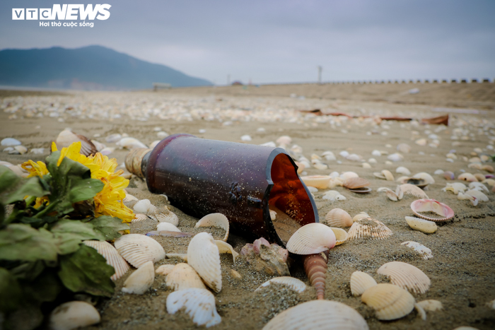 Chai thủy tinh vỡ nằm ngổn ngang gây nguy hiểm cho người dân và du khách đi lại trên bãi biển.