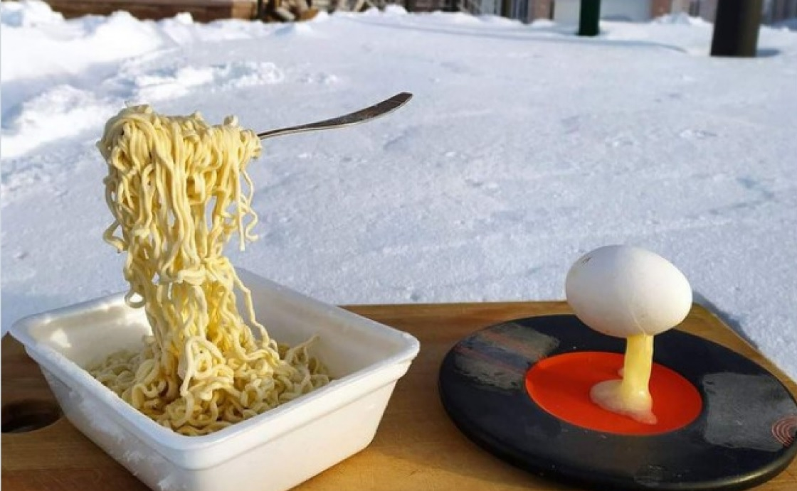 Người đàn ông dại dột ăn sáng ngoài trời ở vùng Novosibirisk khi nhiêt độ xuống dưới -40 độ. Mỳ tôm đông cứng và trứng gà đập ra là hoá thành băng.