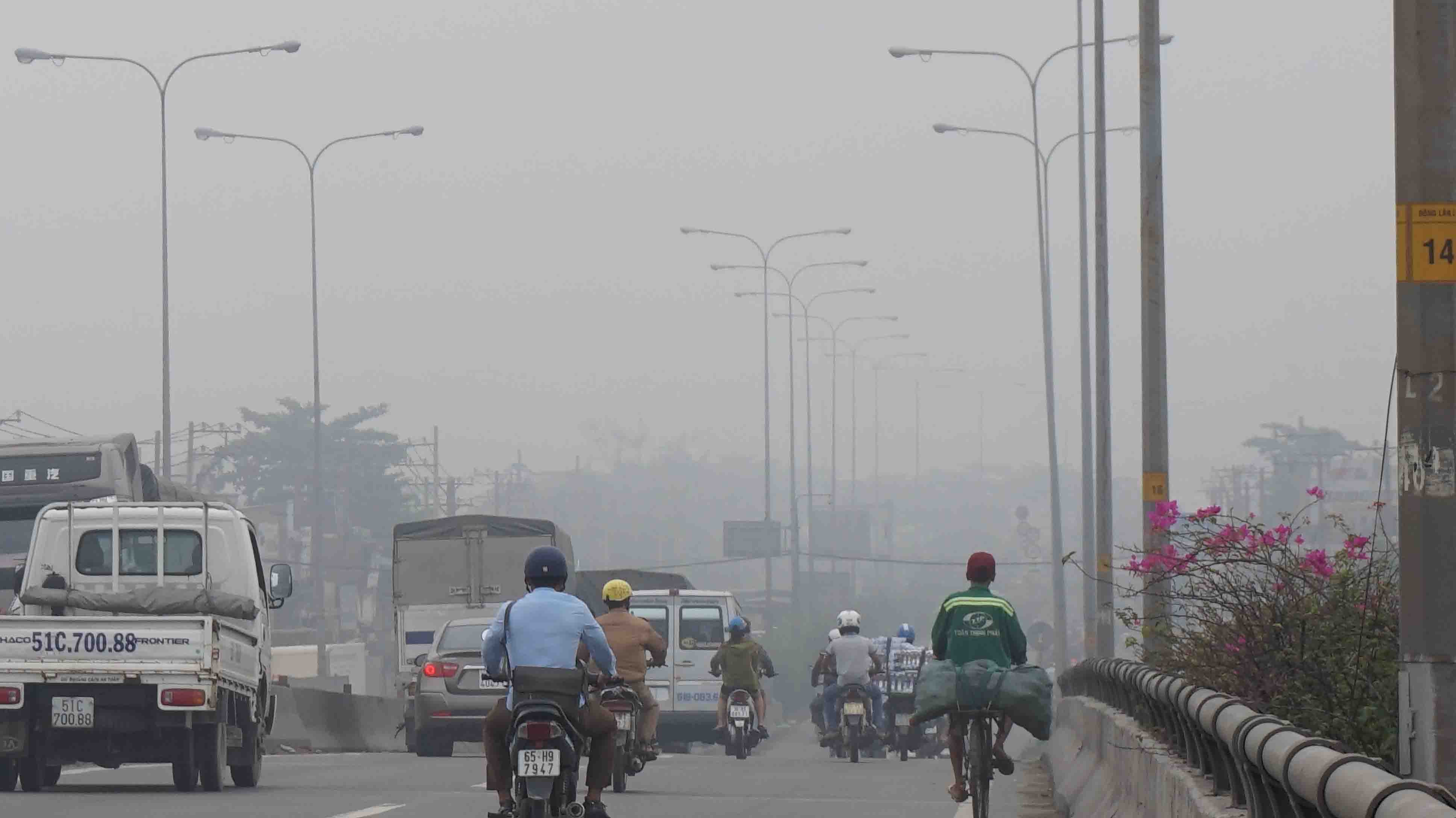 Hơn 8h, các tòa nhà, khu dân cư ở khu vực quận trung tâm là 1,3, 10 và quận vùng ven: 7, 12, Tân Bình, Tân Phú, Hóc Môn, Củ Chi…. bị che khuất trong lớp sương trắng đục.