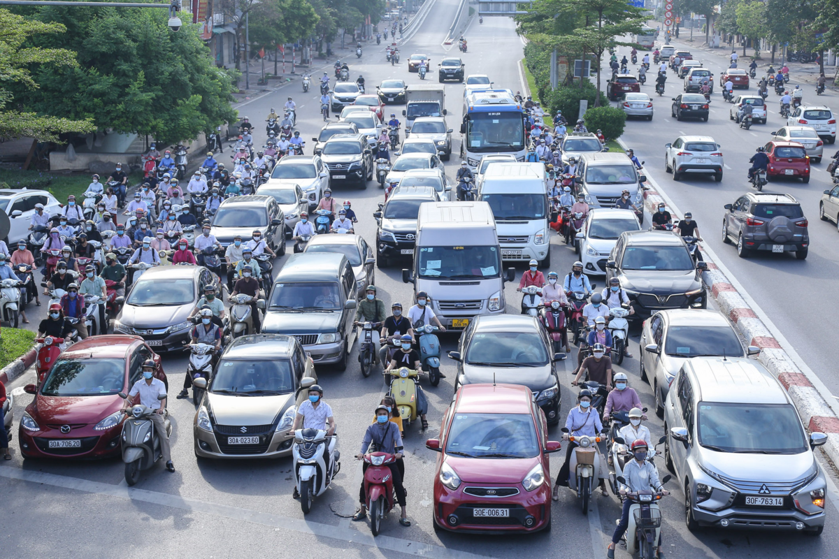 Hình ảnh đông đúc tại nút giao đường Trường Chinh lúc 7h30 trong tuần thứ ba Hà Nội thực hiện giãn cách xã hội.