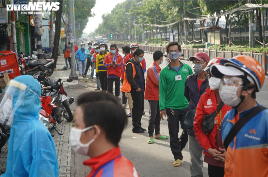 Nguyễn Doãn Thiện (ngụ phường 15, quận Gò Vấp) – tài xế công nghệ hãng NowFood cho biết, sáng nay anh đã qua 4 trạm y tế lưu động tại 4 phường khác nhau nhưng đều không có nhân viên y tế lấy mẫu. “Tôi được các đồng nghiệp thông báo bên trạm y tế lưu động phường 8 có lấy mẫu xét nghiệm cho shipper nên tôi chạy qua và đã thấy mọi người xếp hàng dài rồi”, anh Thiện cho hay.