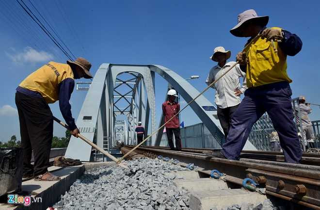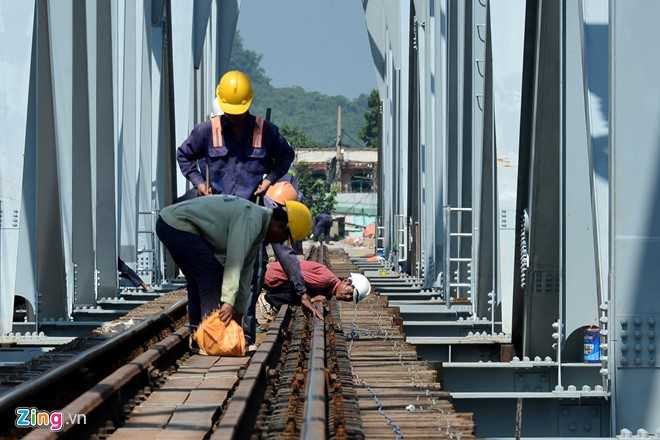 Ngoài phần cầu, hàng chục công nhân đường sắt cũng thi công liên tục để hoàn thành phần đường ray ở hai mố cầu.