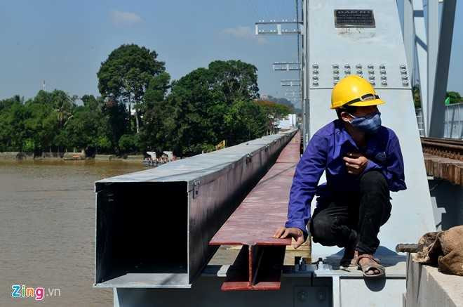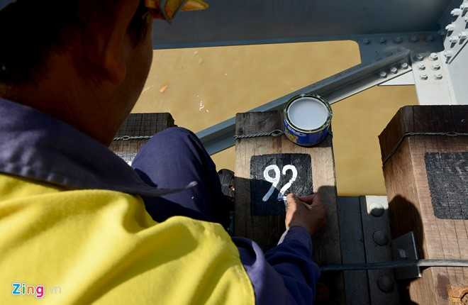 Công nhân ngành đường sắt đánh số thứ tự các thanh tà vẹt. Toàn bộ ba nhịp cầu thép tà vẹt được làm bằng gỗ để tạo êm thuận và giảm tiếng ồn khi tàu qua.