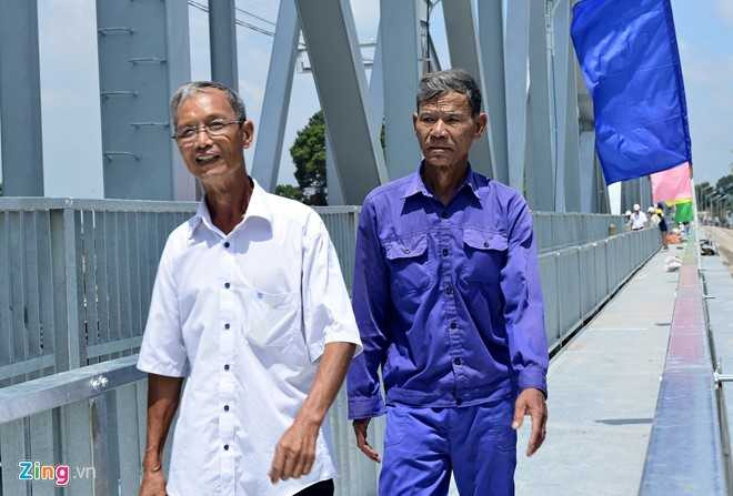 Cùng người bạn thử dạo qua cầu mới, ông Trần Hồng Tâm (áo xanh, ngụ phường Hiệp Hòa, TP Biên Hòa) chia sẻ, cây cầu được xây mới rất hoành tráng, đẹp. "Một phần cầu được lắp đặt đường hai làn cho người dân qua lại rất thuận tiện. Trước đây chỉ lưu thông được một chiều, tôi phải đi vòng, nay qua lại giữa chợ Đồn và chợ Biên Hòa quá dễ dàng", ông Tâm nói.