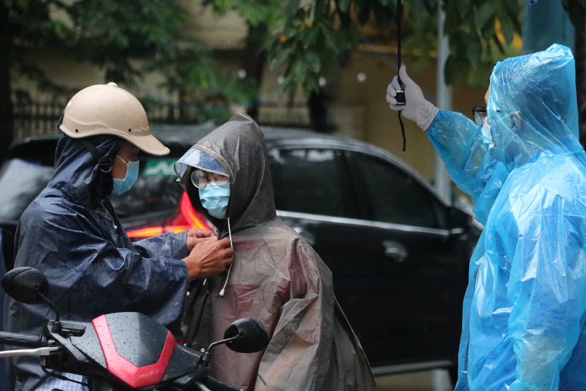 Phụ huynh che ô đưa con vào điểm thi. Theo chỉ đạo của Sở GD&ĐT Hà Nội, phụ huynh không tụ tập, không đứng chờ con ngoài khu vực phòng thi để đảm bảo công tác phòng chống dịch COVID-19.