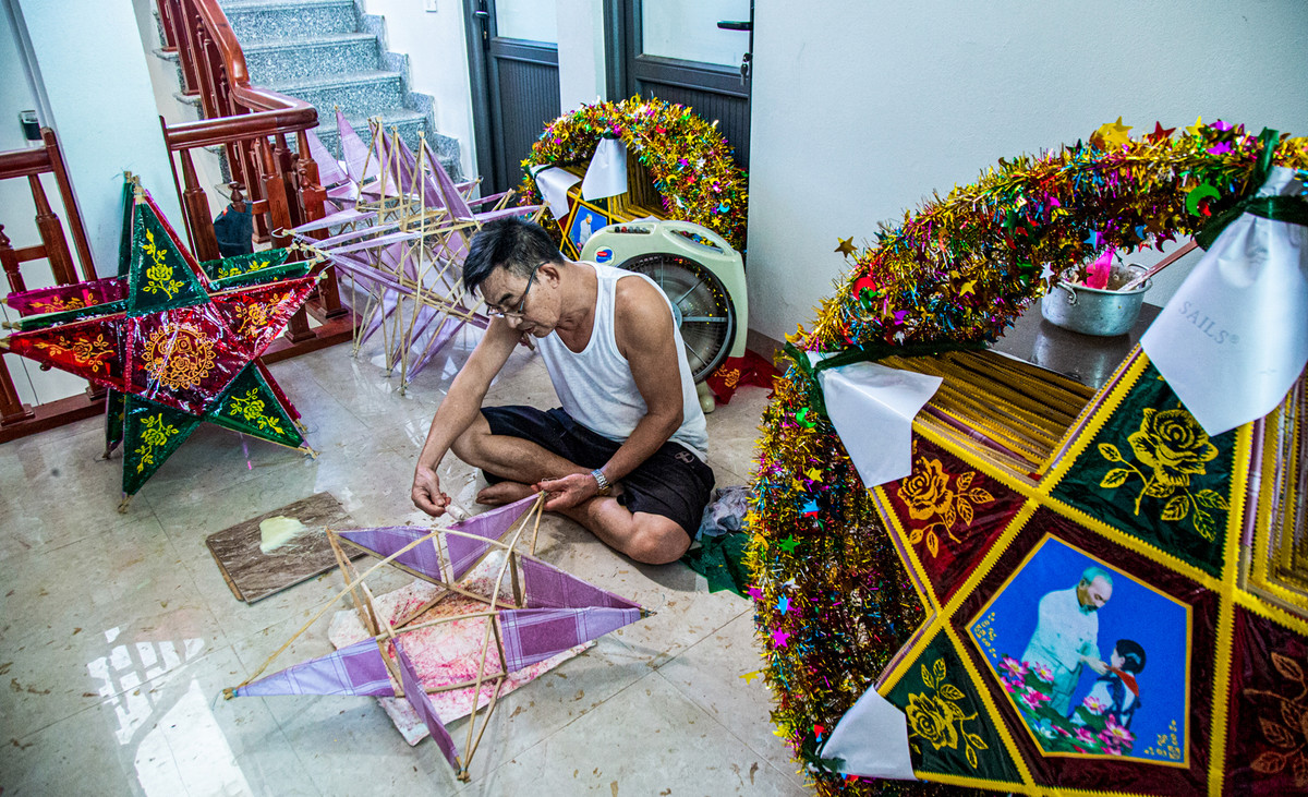 Tất cả các công đoạn để tạo được một chiếc đèn ông sao đều được ông Đình chăm chú, tỉ mỉ. Trung bình một ngày ông Đình làm được khoảng 30 - 40 chiếc loại to.