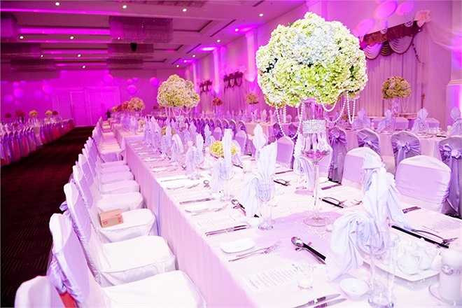 Khu vực sảnh tiệc được trang trí khá sang trọng với tông vằng trắng, khăn trải bàn xếp gấp độc đáo, những bông hoa vàng nổi bật, tạo điểm nhấn lịch thiệp cho không gian lãng mạn.
