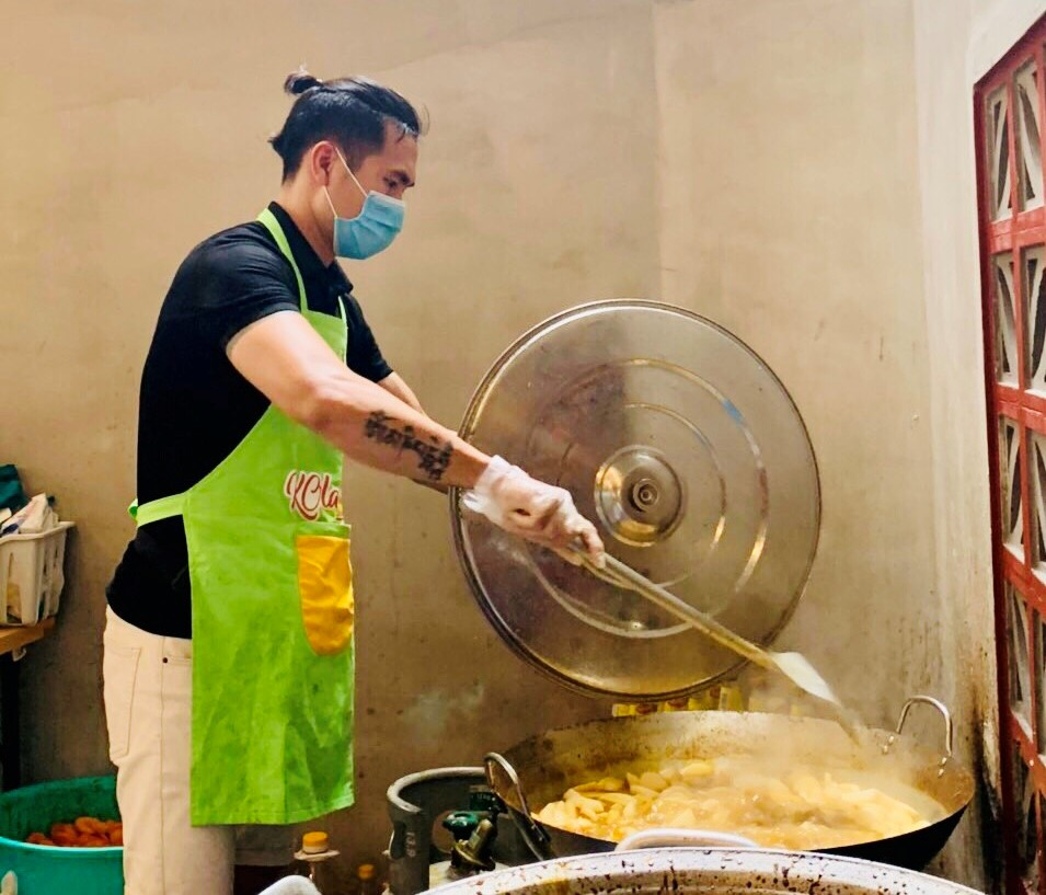Anh Phạm Hữu Tình nấu cơm tại bếp CLB Suối mát từ tâm.
