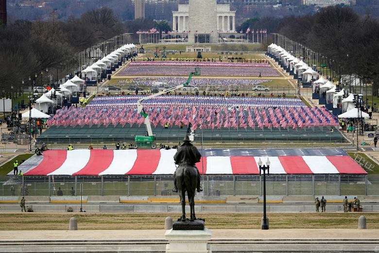Gần 200.000 lá cờ tượng trưng cho những người Mỹ đã thiệt mạng vì COVID-19 và những người không thể tới dự lễ nhậm chức Tổng thống vì lý do an ninh được cắm ở khu vực công viên National Mall, tượng đài Washington và khu tưởng niệm Lincoln. (Ảnh: Reuters)