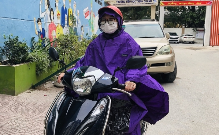 Mặc dù ngoài trời không mưa nhưng nhiều người vẫn mặc áo mưa để chống chọi với thời tiết lạnh buốt.