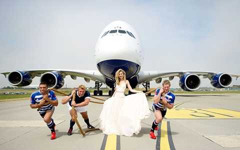 Người mẫu Georgia May Jagger bên cạnh 3 cầu thủ bóng bầu dục kéo chiếc Airbus A380 ở sân bay Manston, Anh