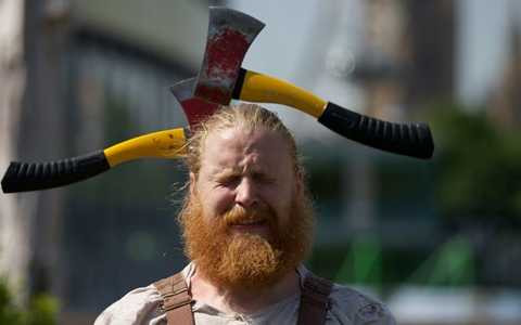 Nghệ sĩ xiếc người Canada, Matias Salmenaho, đứng im trong khi bạn diễn ném 2 chiếc rìu qua đầu