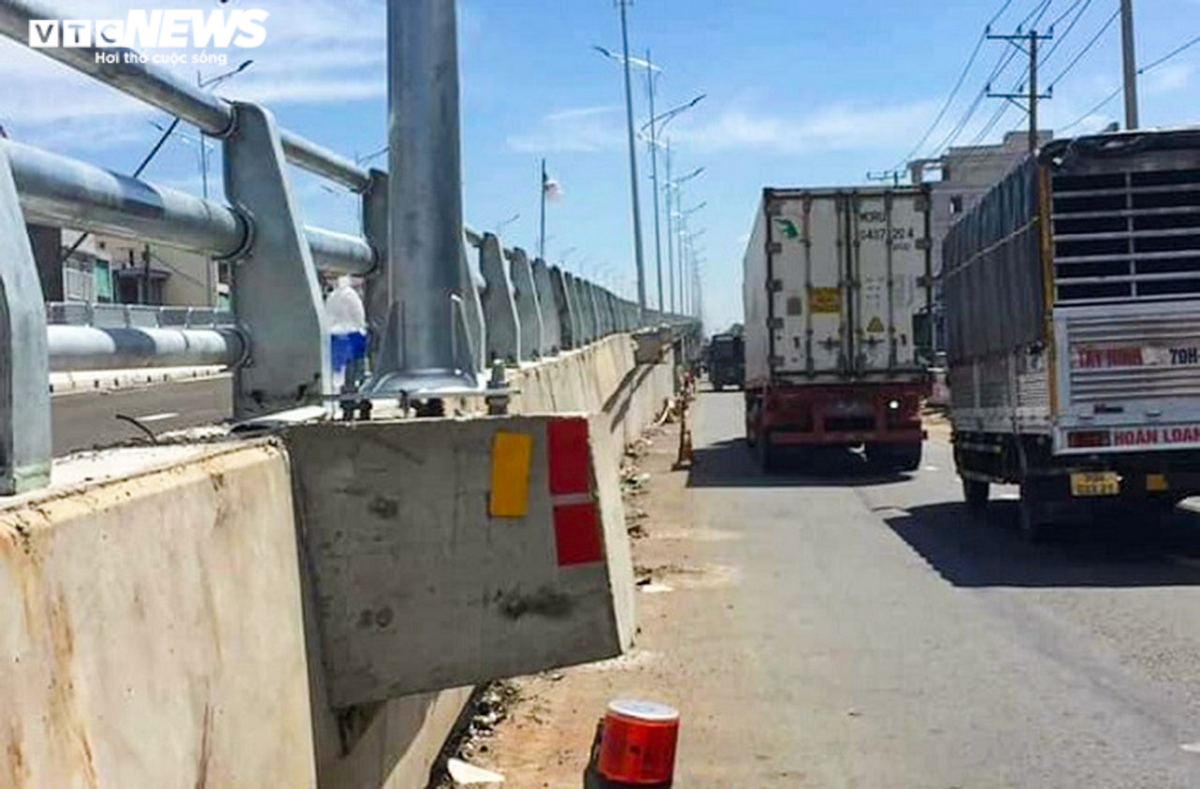 "Cụ thể, sát tường chắn 2 bên cầu vượt phía mố M1 (phía Bắc) có một đường viên vỉa chôn phía dưới, phần trụ đèn nằm trong phạm vi này nên không tác động đến người đi đường. Riêng mố 2 (phía Nam) do lưu lượng xe quá đông, đơn vị không thể chặn đường để chôn các viên vỉa xuống", ông Mậu nói.