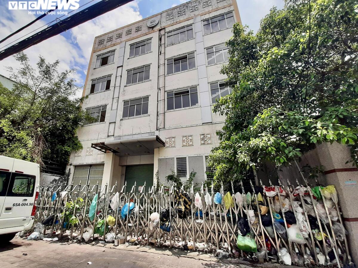 Cổng rào đầy rác vì tòa nhà bị bỏ hoang nhiều năm.