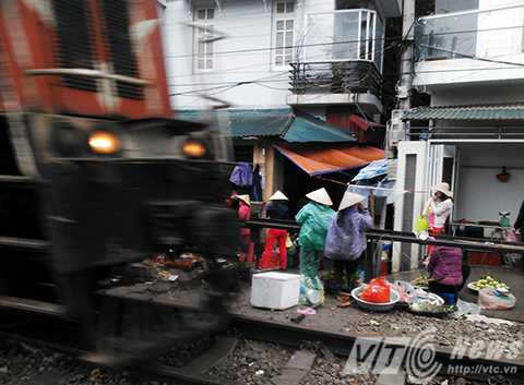 | Khi nghe tiếng còi tàu từ xa, nhiều tiểu thương mới vội vàng di chuyển hàng hóa ra khỏi đường ray |