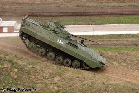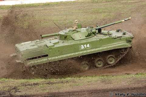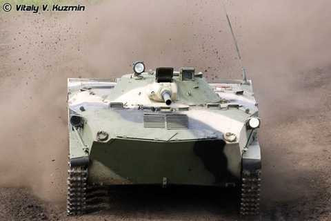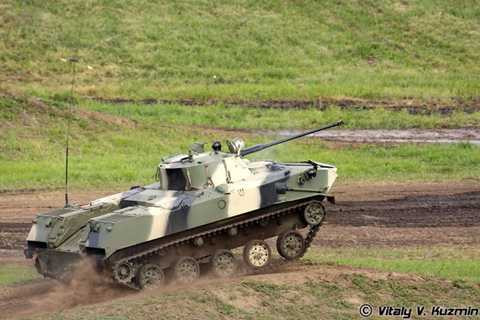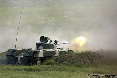 | Các loại xe thiết giáp chiến đấu Nga cũng được đánh giá rất cao về hỏa lực, cơ động. Ảnh: Xe chiến đấu đổ bộ đường không BMD-2 khai hỏa pháo 30mm trong tư thế “quỳ” (trùng xích, thân xe được hạ thấp). |