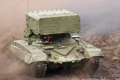 | Pháo phun lửa hạng nặng TOS-1 cũng không thua kém trong khả năng cơ động nhờ đặt trên khung gầm tăng T-72 vốn đã có tốc độ cao. |