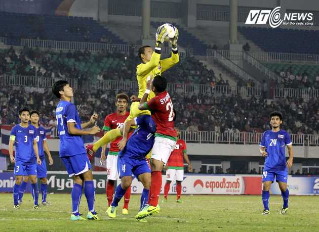 | Thủ thành Kawin Thamsatchanan của Thái Lan băng ra bắt bóng |